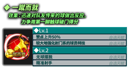 博格坎普还自带自选天赋【一蹴而就】,等级一时较大地强化射门系的球员特技,等级二时更可以解锁【无球摆脱】与【精准射手】,让他用跑位和无与伦比的射术敲开对手的大门!