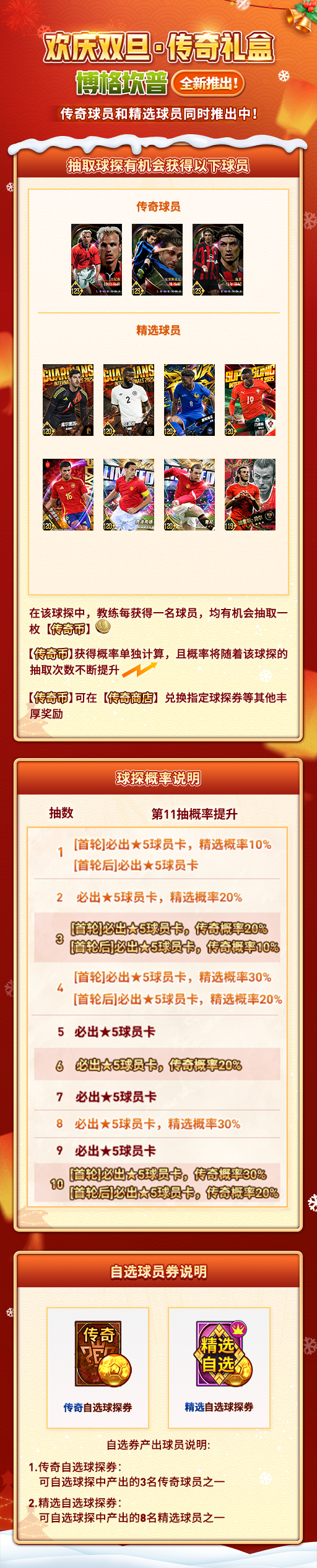 【欢庆双旦·传奇礼盒】即将登场!各位教练有机会签下博格坎普、维埃里和马尔蒂尼这三位传奇球星,以及库尔图瓦、吕迪格、楚阿梅尼、门德斯、罗德里戈、费迪南德、鲁尼和贝尔这八位强大的球星!如果想要提升球队实力的话,请不要错过此次活动!