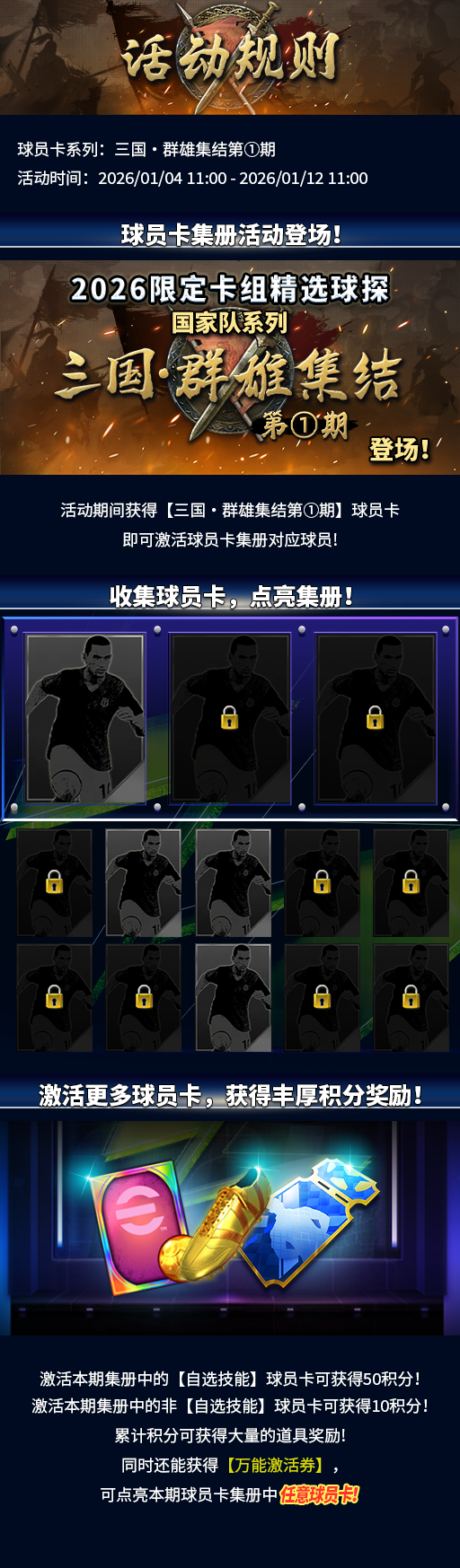 【球员卡集册·三国·群雄集结第①期】现已上线,活动期间,玩家每获得【三国·群雄集结第①期】球员卡,即可激活球员卡集册对应球员!激活球员可获得积分,累计积分可获得大量道具奖励及【万能激活券】,【万能激活券】可激活任意未点亮球员卡!